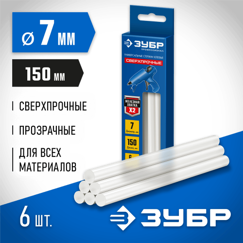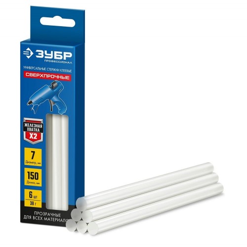 ЗУБР 6 шт., 50 г, 7 х 150 мм (7-8 мм), прозрачные, сверхпрочные клеевые стержни 06855-6 Профессионал