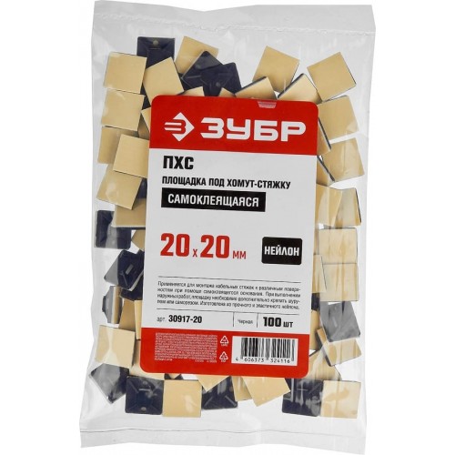 Площадка под хомут черная ЗУБР 30917-20, предназначена для стяжки кабелей и проводов в пучки, а также крепления электропроводки к различным поверхностям. Стяжки, клипсы, дюбель-хомуты и монтажные площадки легко, быстро и удобно монтировать как внутри, так и вне помещений. Площадки с самоклеящимся основанием быстро и надежно закрепят хомут (стяжку) для кабеля электропроводки на гладкой поверхности внутри зданий и сооружений. При выполнении наружных работ площадки необходимо дополнительно крепить шурупом или саморезом.