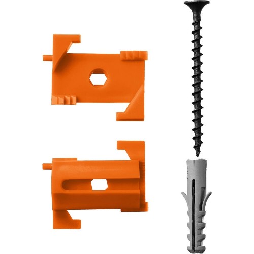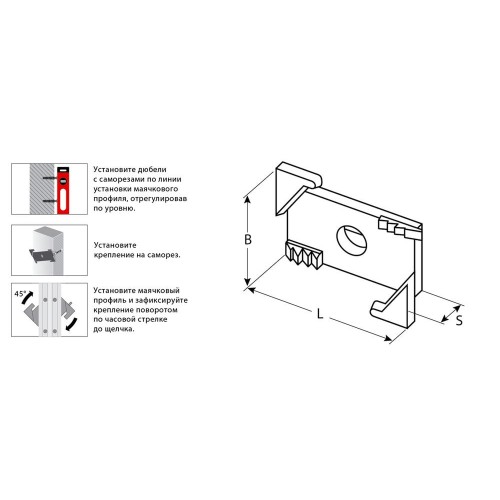 Для установки и выравнивания штукатурного маяка в процессе отделочных работ. Порядок установки: 1. Нанесите на стену вертикальные линии в местах установки штукатурных маяков, просверлите отверстия диаметром 6мм и глубиной 40мм, по линии, из расчета 5-6 отверстий на один штукатурный маяк 2. Вставьте в отверстия дюбели 6х30мм, вкрутите саморезы 3,5х51мм (или другой длины, если необходимо) и выровняйте по уровню или отвесу головки саморезов крайних штукатурных маяков 3. Установите крепления штукатурных маяков на вкрученные саморезы, расположив их под углом 45° относительно линии установки штукатурного маяка. Установите крайние штукатурные маяки и зафиксируйте их, повернув крепления по часовой стрелке до щелчка. 4. После установки крайних штукатурных маяков натяните между ними нить и, если это необходимо, скорректируйте положение крайних штукатурных маяков путем вкручивания и выкручивания саморезов, добиваясь минимаотного расстояния между нитью и наиболее выступающим участком стены 5. Пос
