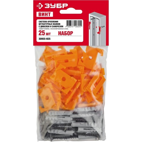 Набор СКШМ в комплекте с дюбелем и саморезом ЗУБР ВИНТ-Н25 3095-Н25, предназначена для значительного ускорения и облегчения проведения отделочных работ. Благодаря точности установки маяков достигается существенная экономия стройматериалов. Данная система обладает легкой установкой штукатурных маяков благодаря специальному крепежу, удобной регулировкой положения штукатурного маяка путем вкручивания и выкручивания саморезов и высокой точностью при установке штукатурных маяков, позволяющей минимизировать толщину штукатурного слоя. Саморезы и дюбели для установки поставляются в комплекте.