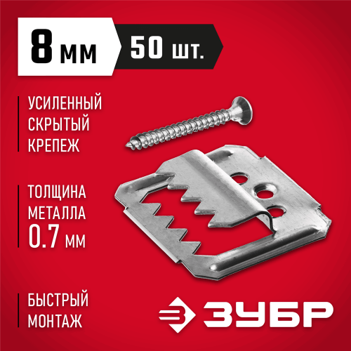 Крепежные скобы для вагонки (кляймеры) ЗУБР 30755-08, применяются для скрытого крепления тяжелой вагонки, имитации бруса и блок-хауса, панелей МДФ, ламинированных панелей. Существенно ускоряют и облегчают проведение отделочных работ, обладая при этом рядом преимуществ по сравнению с традиционным креплением при помощи гвоздей. Установленная скоба позволяет вагонке двигаться вдоль продольной оси, компенсируя напряжения, возникающие при усадке дома. Скоба крепится к лаге и прижимает вагонку, исключая образование на ней сколов и трещин. При изменении температуры и влажности исключается коробление древесины. Крепеж незаметен после установки, придает конструкции эстетичный внешний вид.