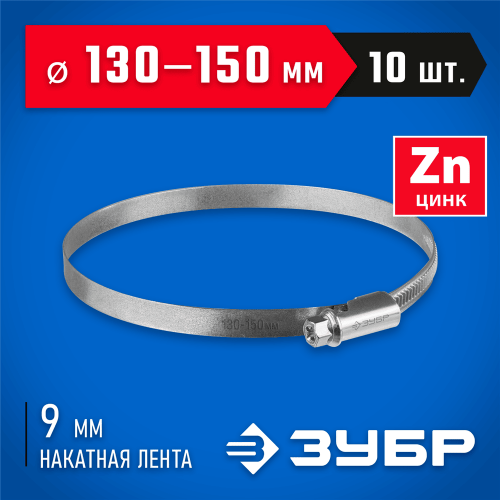 ЗУБР 10 шт, 130-150 мм, оцинкованный, червячный хомут Х-9Н 37807-150