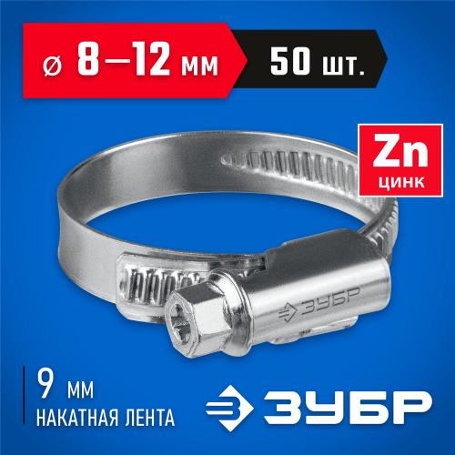 ЗУБР Х-9Н 8-12 мм, накатная лента 9 мм, червячный хомут, цинк, 50 шт (37807-12)