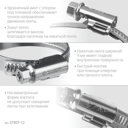 Червячный хомут ЗУБР 37807-12 предназначен для крепления шлангов к патрубкам, работающим в условиях низких и средних давлений и вибраций, а также кабелей и проводов. Состоит из штампованной ленты и винта с червячной резьбой. Накатная лента с гладкой внутренней поверхностью предотвращает повреждения скрепляемых материалов. Шестигранная головка и шлиц PH позволяют использовать при монтаже гаечный ключ или шлицевую отвертку. Цинковое покрытие надежно защищает от коррозии.