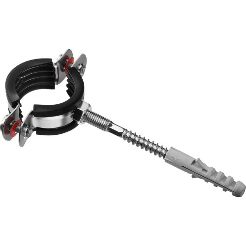 - Комплектность набора позволяет крепить хомут как с помощью гайки, так и с использованием шпильки и дюбеля