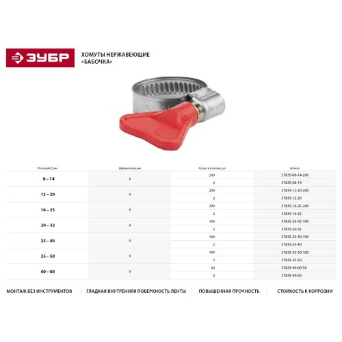 Хомут металлический ЗУБР 37835-25-40-100, предназначен для крепления шлангов к патрубкам, а также широко применяются в автомобилестроении, машиностроении, при выполнении авторемонтных, садовых, сантехнических и прочих работ. Хомут червячный состоит из накатной ленты и замка с пластиковым ключом. Пластиковый ключ обеспечивает возможность установки хомута без помощи инструментов. Накатная лента имеет гладкую внутреннюю поверхность, что обеспечивает высокую герметичность соединения без повреждения поверхности скрепляемых материалов. Изготовленный из нержавеющей стали хомут обладает повышенной прочностью и коррозионостойкостью. Червячный винт снабжен пластиковым ключом, что позволяет установить хомут без помощи инструментов. Хомут предназначен для многократного использования.