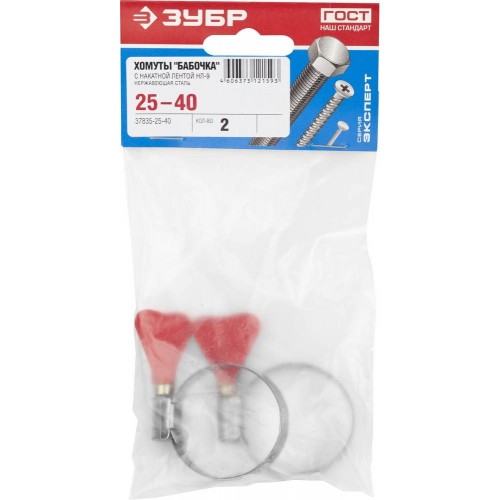 Хомут металлический ЗУБР 37835-25-40, предназначен для крепления шлангов к патрубкам, а также широко применяются в автомобилестроении, машиностроении, при выполнении авторемонтных, садовых, сантехнических и прочих работ. Хомут червячный состоит из накатной ленты и замка с пластиковым ключом. Пластиковый ключ обеспечивает возможность установки хомута без помощи инструментов. Накатная лента имеет гладкую внутреннюю поверхность, что обеспечивает высокую герметичность соединения без повреждения поверхности скрепляемых материалов. Изготовленный из нержавеющей стали хомут обладает повышенной прочностью и коррозионостойкостью. Червячный винт снабжен пластиковым ключом, что позволяет установить хомут без помощи инструментов. Хомут предназначен для многократного использования.