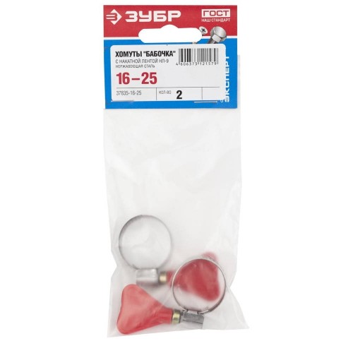 Хомут металлический ЗУБР 37835-16-25, предназначен для крепления шлангов к патрубкам, а также широко применяются в автомобилестроении, машиностроении, при выполнении авторемонтных, садовых, сантехнических и прочих работ. Хомут червячный состоит из накатной ленты и замка с пластиковым ключом. Пластиковый ключ обеспечивает возможность установки хомута без помощи инструментов. Накатная лента имеет гладкую внутреннюю поверхность, что обеспечивает высокую герметичность соединения без повреждения поверхности скрепляемых материалов. Изготовленный из нержавеющей стали хомут обладает повышенной прочностью и коррозионостойкостью. Червячный винт снабжен пластиковым ключом, что позволяет установить хомут без помощи инструментов. Хомут предназначен для многократного использования.