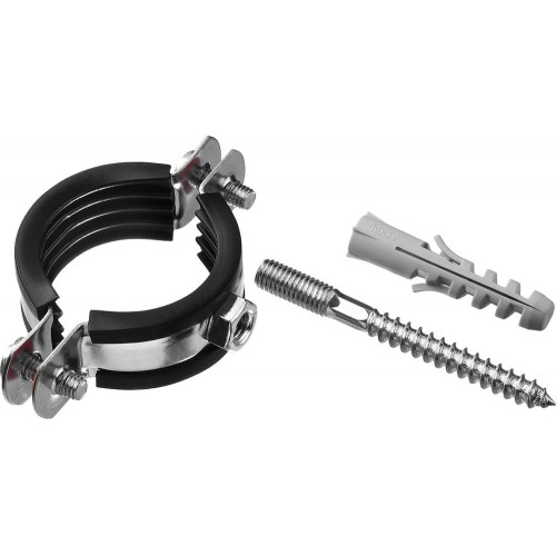 • Комплектность набора позволяет крепить хомут как с помощью гайки, так и с использованием шпильки и дюбеля