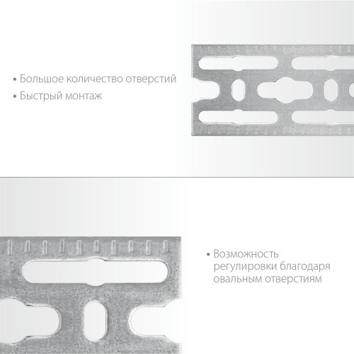 Монтажная шина ЗУБР 310249, предназначена для крепления инженерных коммуникаций - труб, кабелей, электромонтажных конструкций и т.п. Может использоваться для крепления к стене, а также в проходах, шахтах коммуникаций и других узких и труднодоступных местах. Возможность регулировки благодаря овальным отверстиям. Цинковое покрытие надежно защищает от коррозии.