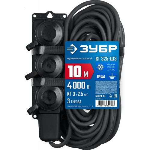 ЗУБР 10 м, 4000 Вт, 3 гнезда, удлинитель силовой КГ 325-Ш3 55024-10 Профессионал