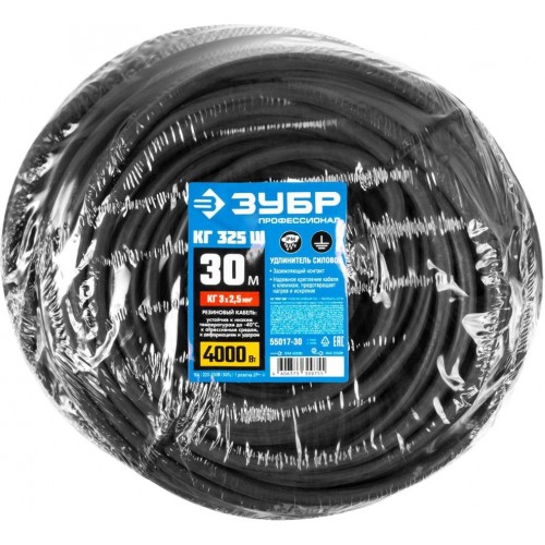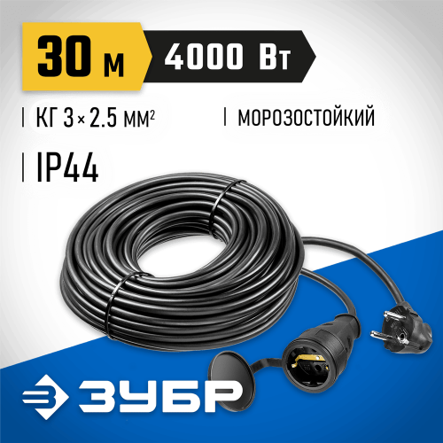 Удлинитель-шнур ЗУБР 55017-30, предназначен для подключения электрических приборов, которые находится на удалении от основного источника сети. Провод КГ (резиновая изоляция) устойчив к низким температурам до -40°С, к агрессивным средам, к деформациям и ударам. Позволяет выполнять работы в любое время года. Заземляющий контакт Провод КГ (резиновая изоляция) устойчив к низким температурам до -40°С, к агрессивным средам, к деформациям и ударам. Степень защиты - IP44 Надежное крепление кабеля к клеммам, предотвращает нагрев и искрение для подключения электрических приборов к сети. Суммарная мощность одновременно подключаемых приборов не должна превышать 4000 Вт.