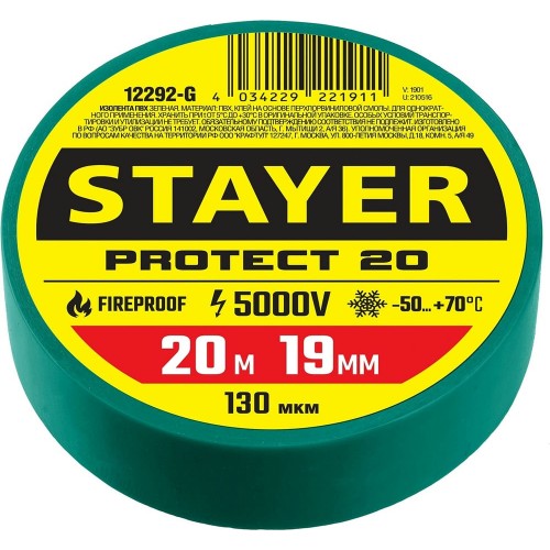 Изолента ПВХ не поддерживает горение Protect-20 STAYER 12292-G, предназначена для изоляции и маркировки проводов при электротехнических работах с напряжением.