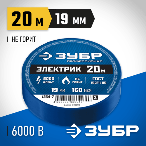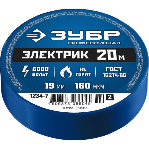 Изоляционная лента ЗУБР 1234-7_z02, предназначена для изоляции и маркировки проводов при электротехнических работах с напряжением до 6000 В, а также для иных хозяйственных работ. Для надежной и быстрой изоляции проводов и труб. Обеспечивает защиту от влаги и электрического тока, не поддерживает горение. ГОСТ 16214-86.