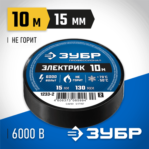 Изоляционная лента ЗУБР 1233-2_z02, предназначена для изоляции и маркировки проводов при электротехнических работах с напряжением до 6000 В, а также для иных хозяйственных работ. Для надежной и быстрой изоляции проводов и труб. Обеспечивает защиту от влаги и электрического тока, не поддерживает горение.