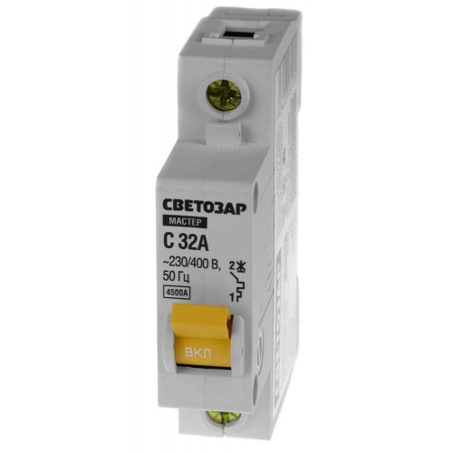 Автоматический выключатель СВЕТОЗАР, 1-полюсный, тип расцепления С, 32 A, 230 / 400 В 49060-32-C выключает сеть при 5-10 кратном превышении номинальной силы тока, тем самым обеспечивая безопасность работы электрического оборудования. Предназначен для установки в помещениях бытового и производственного назначения. Применяются для защиты электрооборудования от перегрузок и короткого замыкания в однофазных электрических цепях напряжением 220/400 В.