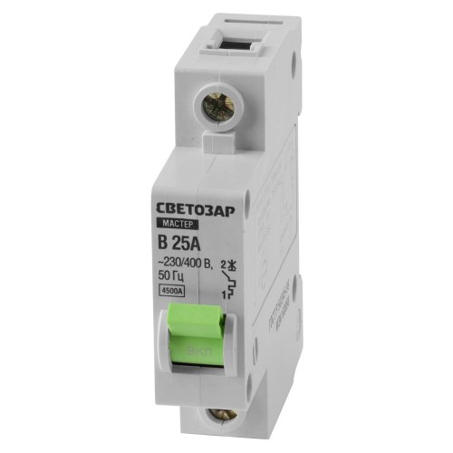 Автоматический выключатель СВЕТОЗАР 49050-25-B, предназначен для защиты от перегрузок в электрических сетях. Корпус выполнен из термостойкого пластика. Устанавливается в жилых или офисных помещениях. Тип расцепления - В, он выключается при 3-5 кратном превышении напряжения в сети. Специальные насечки на прижимных пластинах обеспечивают надежный зажим проводов. Применяются для защиты электрооборудования от перегрузок и короткого замыкания в однофазных электрических цепях напряжением 220/400 В.