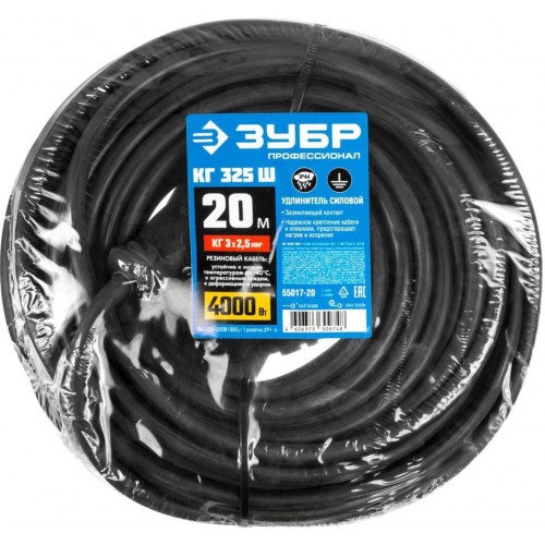 Удлинитель-шнур ЗУБР 55017-20, предназначен для подключения электрических приборов, которые находится на удалении от основного источника сети. Провод КГ (резиновая изоляция) устойчив к низким температурам до -40°С, к агрессивным средам, к деформациям и ударам. Позволяет выполнять работы в любое время года. Заземляющий контакт. Степень защиты - IP44 Надежное крепление кабеля к клеммам, предотвращает нагрев и искрение для подключения электрических приборов к сети. Суммарная мощность одновременно подключаемых приборов не должна превышать 4000 Вт.