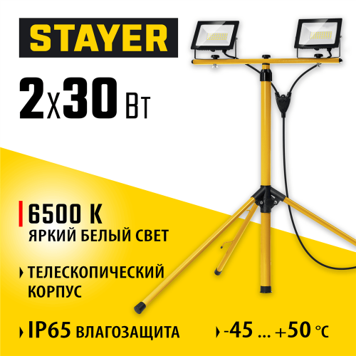 Прожекторы STAYER на штативе - осветительный прибор, состоящий из прочной и устойчивой треноги с двумя прожекторами на основе ярких, высокоэффективных и долговечных источников света. Корпус прожекторов выполнен из алюминиевого сплава литого под давлением, обеспечивающего высокую теплоопередачю. Конструкция прожектора защищена от пыли и влаги (IP65).