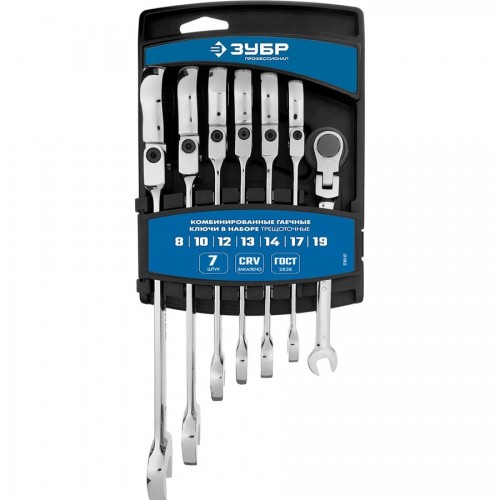 ЗУБР 7 шт, 8 - 19 мм, набор комбинированных гаечных ключей трещоточных шарнирных 27101-H7 Профессионал