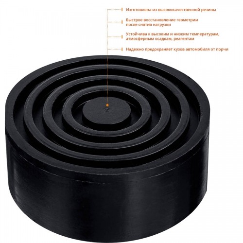 Опора резиновая для домкрата ЗУБР 43005-45, надежно предохраняет возможную порчу ТС при использовании подъемного устройства. Устойчива к высоким и низким температурам, атмосферным осадкам (вода, снег и т.п.). Устойчивое восстановление после снятия нагрузки (минимальное изменение геометрии после длительного сжатия).