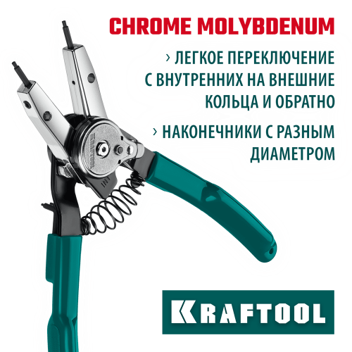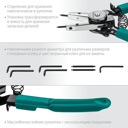 Съемник Kraftool 22813, предназначен для монтажа и демонтажа внутренних или внешних стопорных колец. Наконечники с разным диаметром для различных размеров стопорных колец. Легкое переключение с внутренних на внешние кольца и обратно. Возвратная пружина упрощает работу. Отделения для хранения наконечников в рукоятке. В комплект входит шестигранный ключ для замены наконечников. Маслобензостойкие рукоятки с нескользящим покрытием. Легкое переключение – сдвиньте язычок и сожмите ручки, чтобы снять/наложить внутренние или внешние кольца.