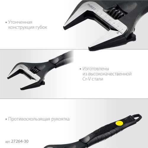 Ключ разводной STAYER 27264-30, предназначен для монтажа и демонтажа резьбовых соединений с широким диапазоном шестигранных профилей гаек и болтов. Эргономичная противоскользящая рукоятка обеспечивает надёжный хват. Изготовлен из высококачественной хромованадиевой стали с фосфатированным покрытием. Улучшенная конструкция губок позволяет работать в труднодоступных местах. Увеличенный захват зева позволяет работать с крепежом большого размера.