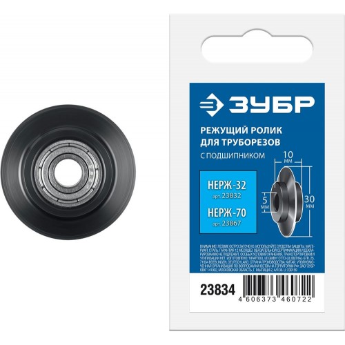 Режущий ролик для труборезов ЗУБР 23834 применяется в качестве сменного режущего элемента труборезов. Качественный рез нержавеющих, стальных, медных, алюминиевых, латунных, бронзовых труб с толщиной стенки до 2 мм. Ролик на игольчатом подшипнике для легкого хода. Режущий ролик изготовлен из легированой стали, закален до 55 HRC. Для трубореза
