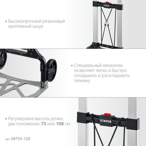 Тележка хозяйственная STAYER 38755-120, предназначена для транспортировки различных грузов, вес которых не превышает 120 кг. Складная конструкция обеспечивает комфортное хранение и транспортировку тележки в сложенном состоянии. Телескопическая рукоятка легко регулируется по высоте. Лёгкая и надёжная благодаря использованию современных материалов. Сложение/разложение за счёт одного движения ногой. Высокопрочный резиновый крепежный шнур, прилагающийся к тележке, позволяет надежно зафиксировать груз.