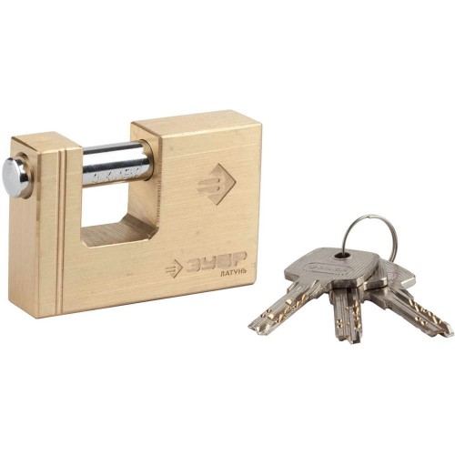 Замок навесной, латунный корпус, П-образная форма ЗУБР 37295-70, предназначен для запирания хозяйственных помещений и всевозможных предметов быта. Корпус и механизм замка изготовлены из латуни, чем обеспечивается повышенная стойкость замка к неблагоприятным воздействия окружающей среды. Специальная П-образная форма корпуса повышает защиту дужки от перепиливания. Закаленная дужка из высококачественной стали обеспечивает максимальную защиту от взлома. Совершенный цилиндровый механизм, изготовленный с использованием компьютерных технологий, обеспечивает высокую надежность замка.