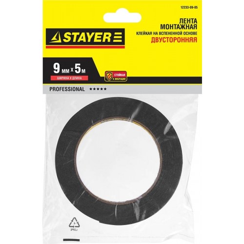 STAYER 9 мм х 5 м, черная, на вспененной основе, двусторонняя клейкая лента (скотч) 12233-09-05