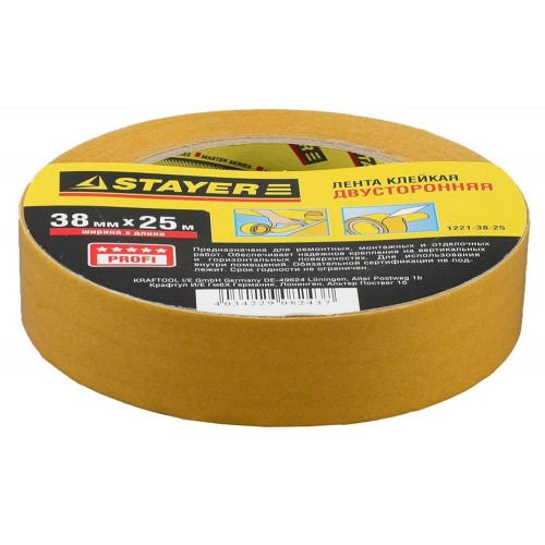 Двусторонняя клейкая лента STAYER 1221-38-25, предназначена для различных ремонтных и монтажных и отделочных работ. Для использования внутри помещений. Эластичная двусторонняя клейкая лента обеспечивает прочное крепление элементов на вертикальных и горизонтальных поверхностях.