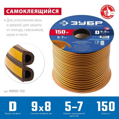 Уплотнитель резиновый самоклеящийся ЗУБР 40930-150_z01, предназначен для уплотнения окон и дверей для защиты от холода, сквозняков, шума и пыли. Обеспечивает высокую тепло- и звукоизоляцию. Влагонепроницаемый. Обладает отличной эластичностью. Высокая износостойкость. Надежная адгезия к поверхности. Быстрый и легкий монтаж. Термоустойчивость (-30... +80 °С).