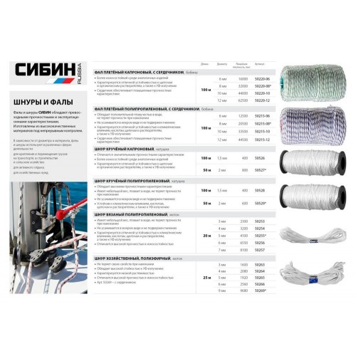 Фал СИБИН 50215-12, плетёный полипропиленовый с сердечником, предназначен для хозяйственно-бытового применения. Обладает положительной плавучестью в воде, не теряют прочности при намокании. Не усаживаются в мокром виде и не подвержены гниению. Характеризуются отличной устойчивостью к климатическим влияниям, кислотам, щелочам и растворителям, хорошей устойчивостью к УФ-излучению
