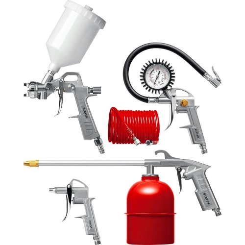 Набор пневматический универсальный STAYER 06488-H5_z01, предназначен для нанесения всех видов лакокрасочных и защитных покрытий на поверхности из пластика, металла, дерева, керамики, для продувки и очистки поверхностей и отверстий от загрязнений сжатым воздухом, для накачивания автомобильных шин. Специальная форма воздушной головки.
