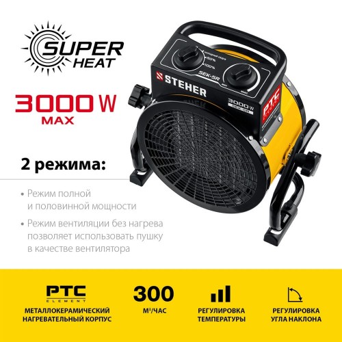 Электрические тепловые пушки STEHER серии SEK – компактные пушки в круглом корпусе для обогрева небольших помещений. Благодаря небольшим размерам тепловую пушку легко переносить и хранить. Устройства оснащены долговечным металлокерамическим нагревательный элементом,обеспечивающий быстрый равномерный нагрев, экономное потребление электроэнеергии и не сушит воздух. Механический терморегулятор поддерживает нужную температуру нагрева.За счет большой площади теплообмена и небольшой температуры нагрева элемента, воздух быстро прогревается. Изделие можно оставлять на долгое время и не бояться за сохранность помещения, так как конструктивные меры безопасности защищают Вас и изделие при нештатных ситуациях.