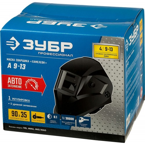 Маска сварщика с автоматическим светофильтром А 9-13 ЗУБР 11076, предназначена для защиты органов зрения во время сварки. Обеспечивает отличную видимость во время работ. Защищает лицо и глаза сварщика от яркого светового, ультрафиолетового и инфракрасного излучения, брызг расплавленного металла и искр при выполнении сварочных работ, резки и пайки металла.