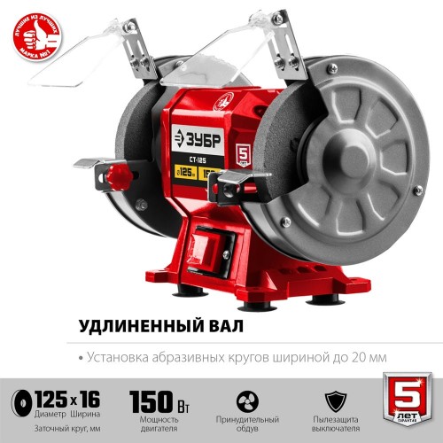 Станок точильный ЗУБР СТ-125, предназначен для заточки и сухой шлифовки металлических заготовок и режущего инструмента. Незаменимый инструмент для гаража, мастерской и используемый для заточки и сухой шлифовки металлических заготовок и режущего инструмента. Имеет простую конструкцию, высокую надежность, компактный размер, два камня с разной зернистостью – все, что нужно для настоящего мастера, ценящего качество. Есть пылезащищенный выключатель для беспроблемной эксплуатации. Для защиты оператора от продуктов обработки имеются прозрачные экраны. Возможность крепления к опорной поверхности.