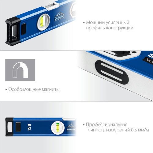 Магнитный строительный уровень ЗУБР 34572-150, предназначен для контроля горизонтальности и вертикальности поверхностей. Точность измерений 0.5 мм/м. Особомощные редкоземельные магниты. 3 ударопрочные колбы с гарантией 50 лет. Зеркальная колба упрощает измерения вертикальных поверхностей. Фрезерованная базовая поверхность.