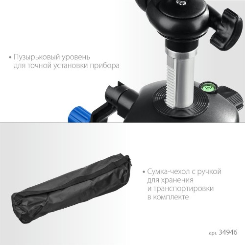 Профессиональный аксессуар для работы с лазерным, оптическим и фотоинструментом. Прибор можно точно установить на нужной высоте при помощи выдвижной колонки. Выполнен из алюминиевого сплава, благодаря чему имеет небольшой вес. А за счёт малого размера штатив легко носить и легко с ним работать.