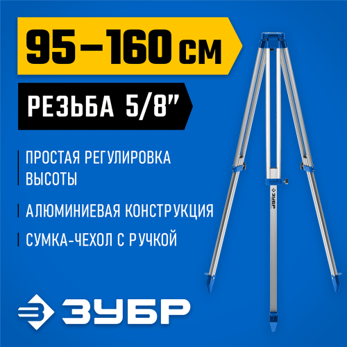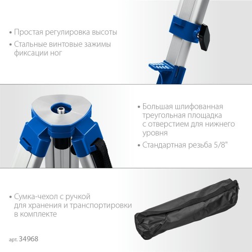 Штатив геодезический ЗУБР 34968, предназначен для работы с лазерным, оптическим и фотоинструментом. Выполнен из алюминиевого сплава, благодаря чему имеет прочную конструкцию и оптимальный вес. Прибор можно точно установить на нужной высоте при помощи раздвижных ножек.