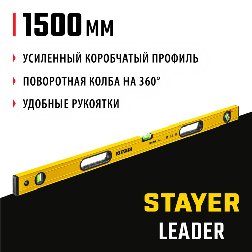 Уровень строительный STAYER 3466-150_z01, предназначен для контроля горизонтальности и вертикальности поверхностей. Фрезерованная базовая поверхность и рукоятки для удобства измерений. Точность измерений - 1 мм/м. 3 колбы из ударопрочного акрила.