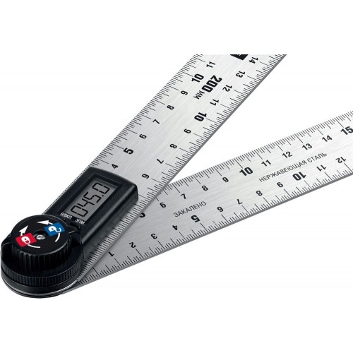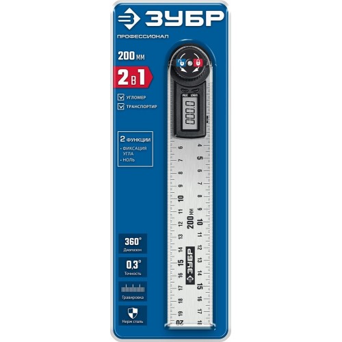 Транспортир-угломер электронный ЗУБР 34294 применяется для измерительных и разметочных работ и контроля выставленных под углом конструкций. Полотно из нержавеющей стали с травленой шкалой увеличивает срок службы инструмента. Электронный модуль обеспечивает высокую точность и скорость проведения измерений. Измерительное полотно изготовлено в соответствии с ГОСТ 427-75.