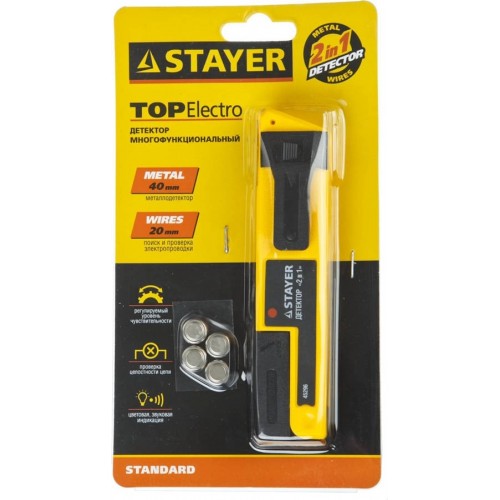 Детектор проводки и металла STAYER 45296, предназначен для обнаружения скрытых металлических конструкций, проводов под напряжением, а также определения полярности элементов питания. Имеет компактный размер, оборудован регулятором уровня чувствительности. Для более комфортной работы оснащен световой и звуковой индикацией. Клипса для удобства переноски и хранения. Проверка электрических приборов. Регулируемый уровень чувствительности. Звуковая и световая индикация. Диэлектрический пластиковый корпус.
