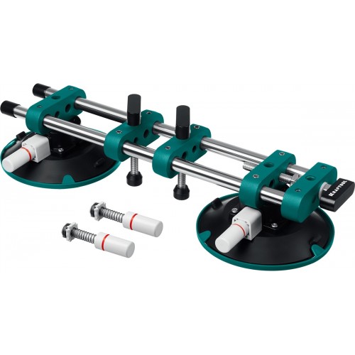 Струбцина с двумя присосками имеет помповые насосы, что позволяет создать нагрузку на шов до 150 кг. Три регулятора позволяют отрегулировать расстояние между двумя плитками и их высоту по плоскости. Крышки на присосках защищают их от загрязнения при хранении и трнспортировке