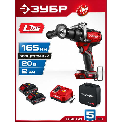 ЗУБР 20 В, 165 Н·м, 2 АКБ LMS (2 А·ч), бесщеточная дрель-шуруповерт, сумка (ДБ-165-22)