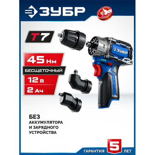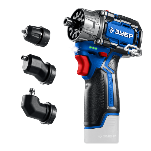 ЗУБР КОМБИ, 12 В, 45 Нм, 3 насадки-патрона, без АКБ, бесщеточная дрель-шуруповерт, Профессионал (DB-125)