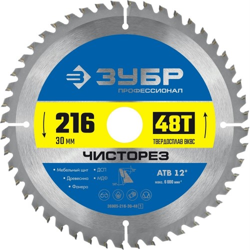 Пильный диск по дереву ЗУБР 36905-216-30-48_z01, предназначен для продольного, поперечного и углового распила древесины и древесных материалов на циркулярных, торцовочных и станковых пилах. вердосплавные резцы марки ВК8С. Автоматизированная высококачественная пайка для надежного крепления зубьев. Закаленный корпус из высоколегированной стали препятствует возникновению биений при работе. Компьютерная балансировка диска для предотвращения биений при работе. Автоматическая трехсторонняя шлифовка зубьев для максимально точной геометрии режущих элементов и чистого реза. Компенсационные прорези исключают внутреннее напряжение и деформацию диска, возникающую при его перегреве во время эксплуатации.