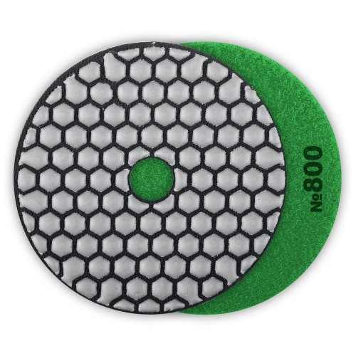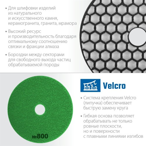 Алмазный гибкий шлифовальный круг (Черепашка) для сухого шлифования ЗУБР 29868-800, предназначен для сухой шлифовки и полировки изделий из натурального и искуственного камня, керамогранита, гранита, мрамора. Используется на ручном электроинструменте (УШМ, полировальные машины, дрели) с насадкой адаптером под липучку Velcro. Охлаждение водой повышает ресурс инструмента. Высокий ресурс и производительность благодаря оптимальному соотношению связки и фракции алмаза. Гибкая основа позволяет обрабатывать не только ровные плоскости, но и поверхности с плавными линиями изгибов. Система крепления Velcro (липучка) обеспечивает быструю замену круга. Широкая сфера применения: обработка каменных столешниц, подоконников, ступеней, скульптур, декоративной плитки, снятие фасок, заусовка, полировка сколов, различные реставрационные работы.