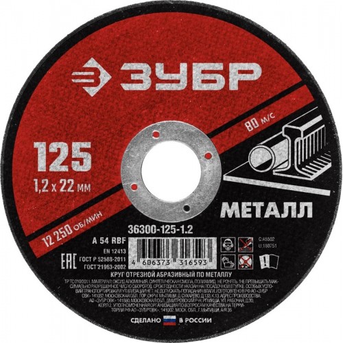 Круг отрезной по металлу ЗУБР 36300-125-1.2, применяется на УШМ при резке металлических конструкций и заготовок. Произведен в Российской Федерации по оригинальной технологии на современном оборудовании.